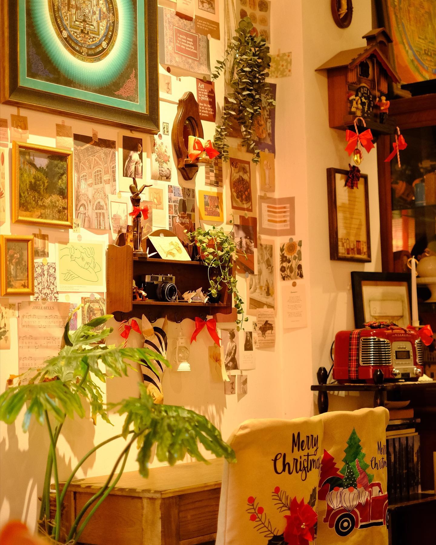Các quán cà phê với lối thiết kế mới lạ đem đến không gian ấm áp, đậm sắc màu tươi vui mùa lễ hội. Tone đỏ, xanh lá ngự trị từ cửa vào đến những mảng tường, bàn ghế, vật dụng trang trí giúp giới trẻ có cảm hứng check-in.