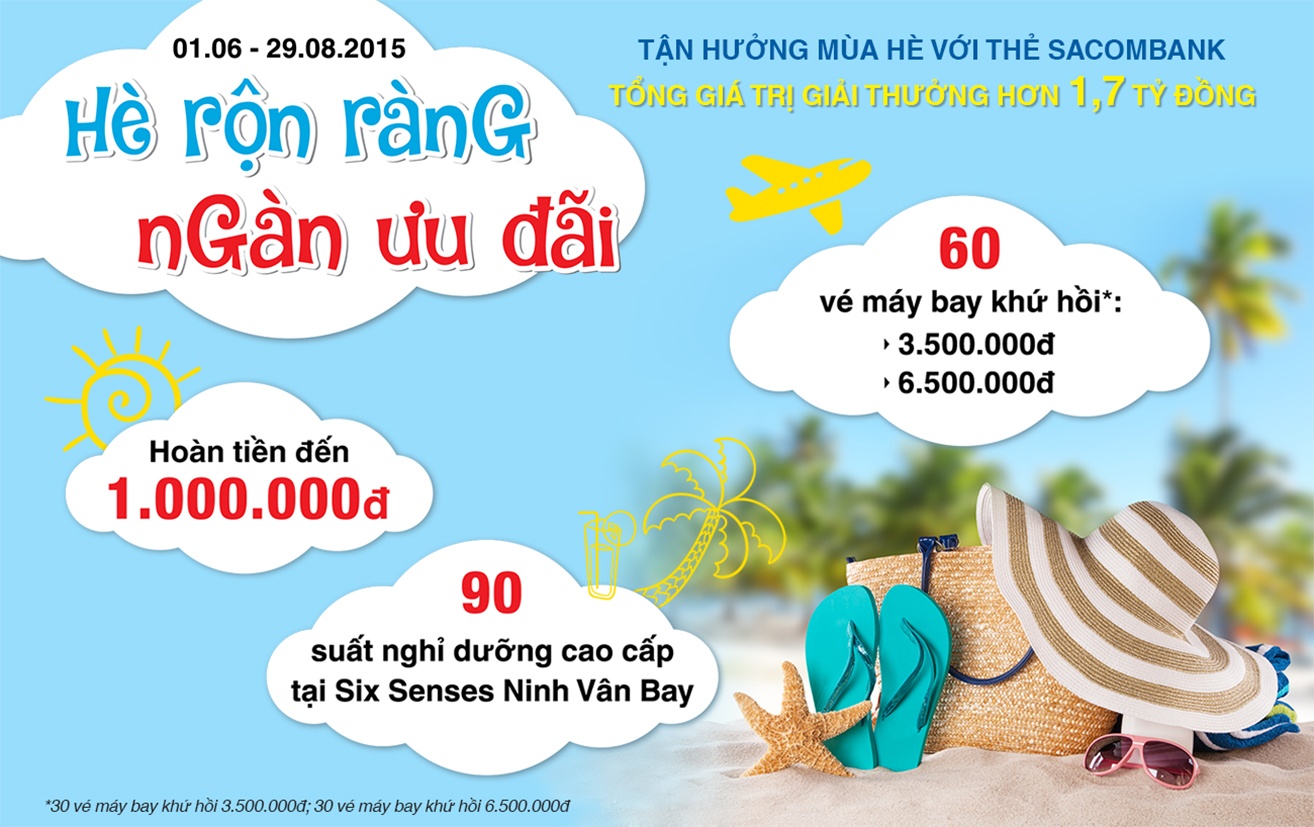 Chào đón hè 2015, từ ngày 1/6 đến hết ngày 29/8, Sacombank triển khai chương trình khuyến mãi “Hè rộn ràng - nghìn ưu đãi” dành cho chủ thẻ tín dụng Sacombank (ngoại trừ chủ thẻ tín dụng Infinite, doanh nghiệp và Family) trên toàn quốc.