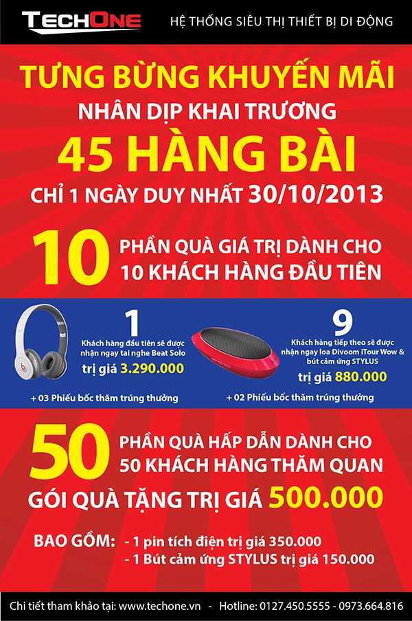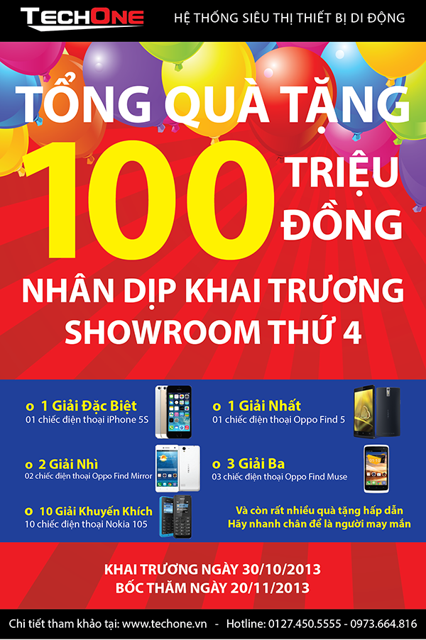 Đặc biệt nhất quý khách hàng sẽ có cơ hội nhận iPhone 5S, OPPO Find 5… miễn phí trong chương trình Bốc thăm trúng thưởng mừng khai trương showroom thứ 4 áp dụng cho tất cả khách hàng khi thăm quan showroom 45 Hàng Bài và áp dùng cho tất cả khách hàng mua hàng tại hệ thống siêu thị di động TechOne
