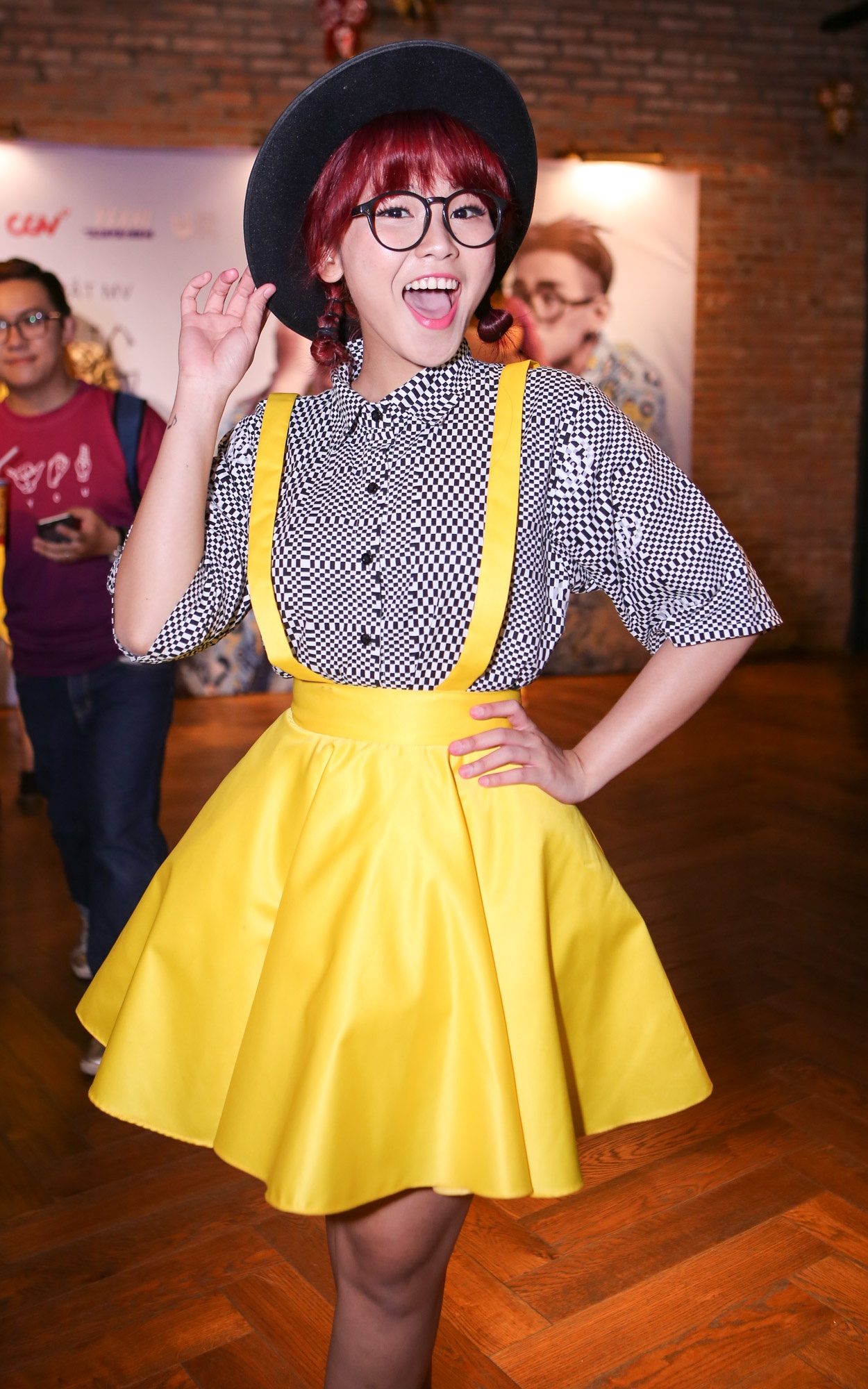 | Hoàng Rapper không chỉ đảm nhận một vai trong MV mà còn là MC buổi họp báo. Nhiều lần, Hoàng Rapper hỏi khó, khiến Tăng Nhật Tuệ bối rối. |