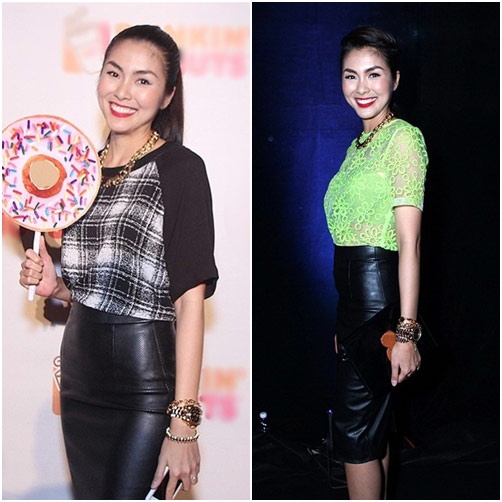 | Tăng Thanh Hà thường xuyên sử dụng lại đồ cũ và phối lại với các trang phục khác nhau. |