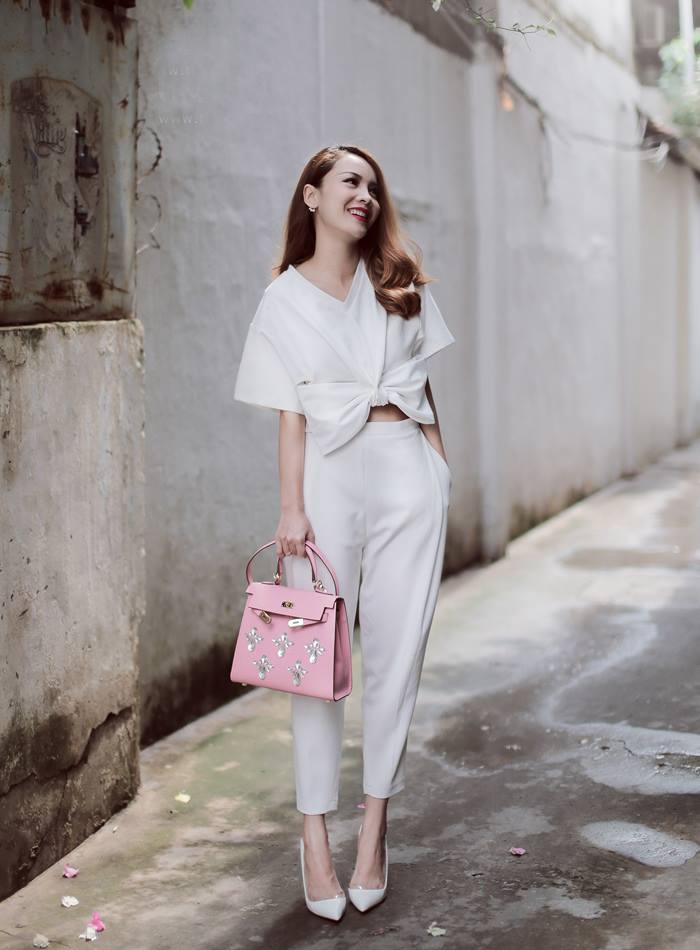 | Tuần qua, Yến Trang lăng-xê mốt "cây trắng". Áo thắt nơ duyên dáng, thanh lịch. Phụ kiện túi xách hồng pastel làm điểm nhấn. |