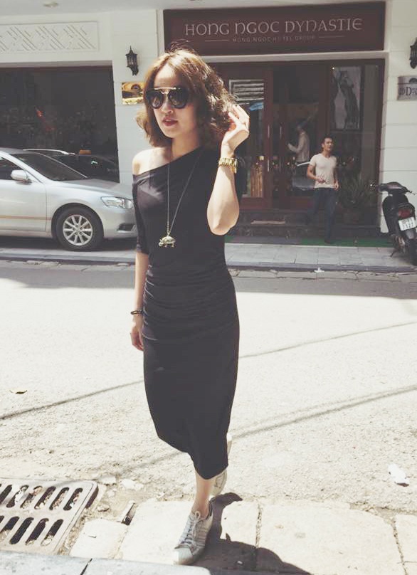 | Mi Vân thể hiện phong cách trẻ trung với đầm thun trễ vai ôm sát, giày thể thao mix ăn nhập mang đến hình ảnh năng động, hiện đại cho bà mẹ một con. |