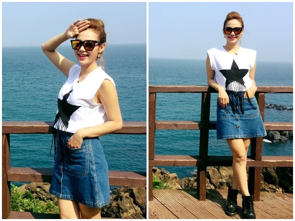 | Minh Hằng có chuyến du lịch Hàn Quốc trong tuần qua. Trên trang cá nhân, Đông Dương của Vừa đi vừa khóc khoe phong cách hiện đại, cá tính. Nữ ca sĩ phóng khoáng trong chân váy denim phối ăn ý cùng áo thun trắng, họa tiết ngôi sao. |