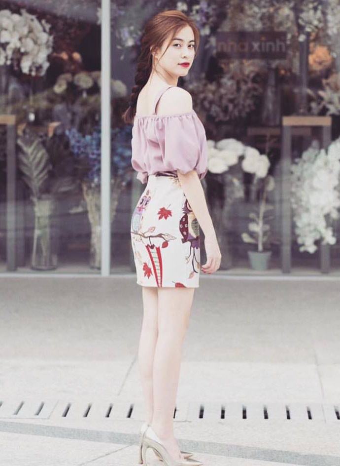 | Hoàng Thùy Linh nhẹ nhàng với áo trễ vai và chân váy "bút chì" họa tiết hoa. Mái tóc tết ăn nhập cùng phong thái nữ tính, duyên dáng. |