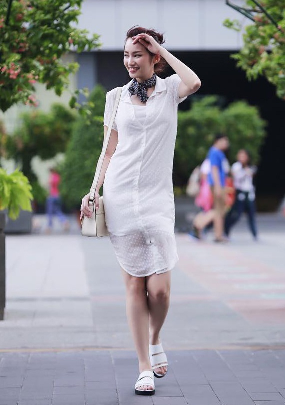 | Người đẹp Trúc Diễm diện áo sơ-mi trắng suông dài khi tản bộ trên đường phố. Cô không quên phối khăn voan mỏng và đi dép bệt thoải mái. |