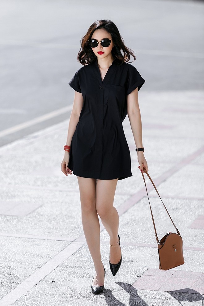 | Đinh Ngọc Diệp khéo léo chọn bộ đầm tối màu, tôn nước da trắng sáng khi sải bộ trên phố trung tâm Sài thành. Người đẹp mix phụ kiện đơn giản nhưng tinh tế. |