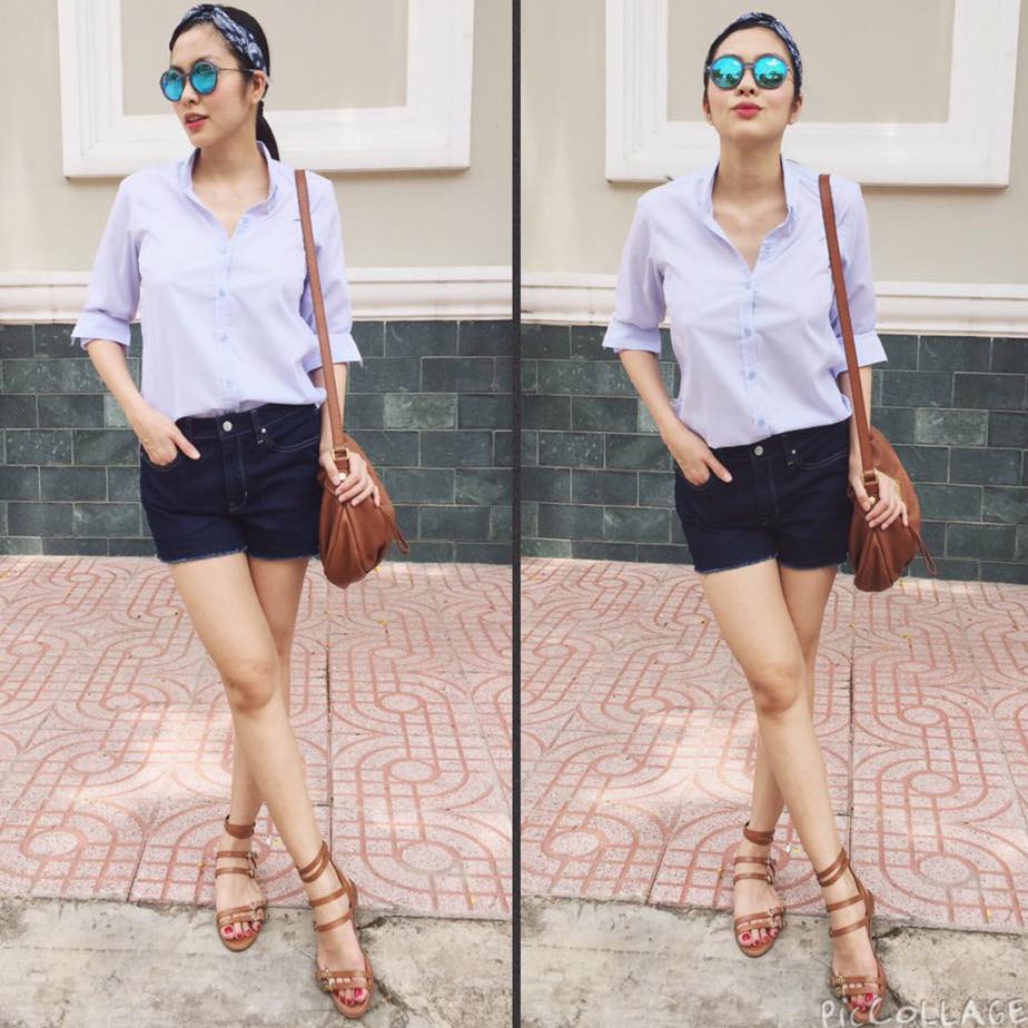 | Dù vậy, người đẹp vẫn trung thành với sơ-mi quen thuộc. Phụ kiện giày sandals và túi xách bắt kịp xu hướng street style hè 2015. |