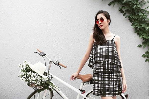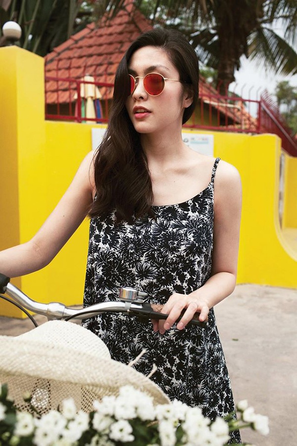 | Trang phục gắn liền với người đẹp thời điểm này có phong cách nhẹ nhàng, họa tiết hợp trào lưu và đậm chất châu Á. Tuần trước, bà mẹ sinh năm 1986 xuống phố với mẫu đầm dây, dáng xòe. Cô diện khi dạo phố bằng xe đạp. |