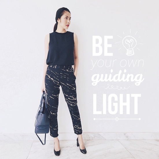 | Người đẹp sinh năm 1986 cho thấy khả năng dùng màu tinh tế khi mix quần âu họa tiết, áo voan mềm mại, túi và giày ton sur ton. |