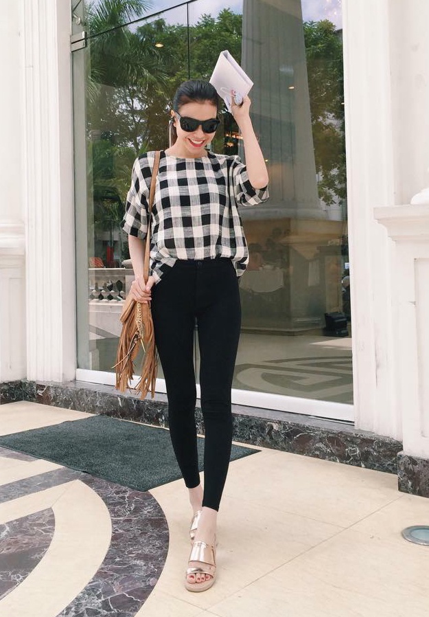 | Một ngày khác, cô diện áo ca-rô quần legging ôm sát cùng giày ánh bạc, túi tua rua khi xuống phố ngày hè. |