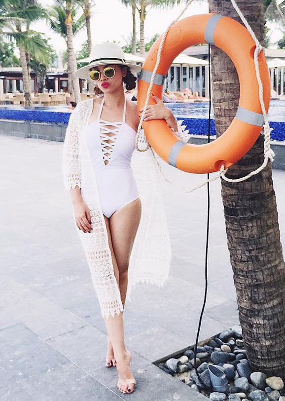 | "Én chị" Yến Trang khoe mốt áo tắm một mảnh ấn tượng, kết hợp ăn ý cùng áo khoác cardigan chất ren mỏng. |