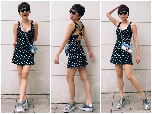 | Tuần qua, Tóc Tiên xuống phố với mốt đầm ngắn, họa tiết chấm phá. Thiết kế ngày hè giúp giọng ca Ngày mai phát huy lợi thế đôi chân thon dài và vẻ khỏe khoắn khi dạo phố Sài thành. Phụ kiện túi mini đeo chéo và giày bata ánh bạc bắt mắt. |