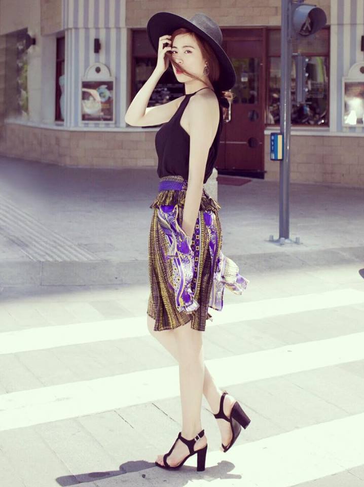 | Hoàng Thùy Linh xuống phố với phong cách hiện đại, năng động nhưng không kém phần nữ tính. Nữ ca sĩ mix sáng tạo giữa chân váy họa tiết và áo voan yếm điệu đà. |