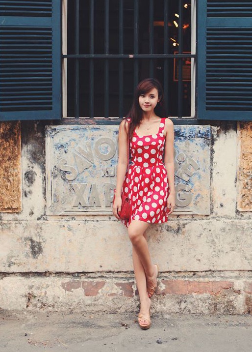 | Midu khoe dáng mảnh mai trong bộ đầm nữ tính, họa tiết chấm bi, tông màu bắt mắt. Cựu người mẫu tuổi teen trang điểm nhẹ nhàng cùng mái tóc suôn thắng. |