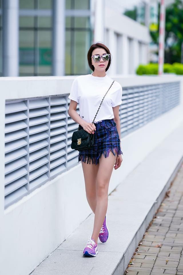 | Trong khi đó, Trà Ngọc Hằng dạo phố với phong cách ngày hè năng động. Cô diện áo thun màu trơn, chân váy tua rua cá tính cùng đôi giày bata sắc màu tím neon bắt ánh nhìn. |