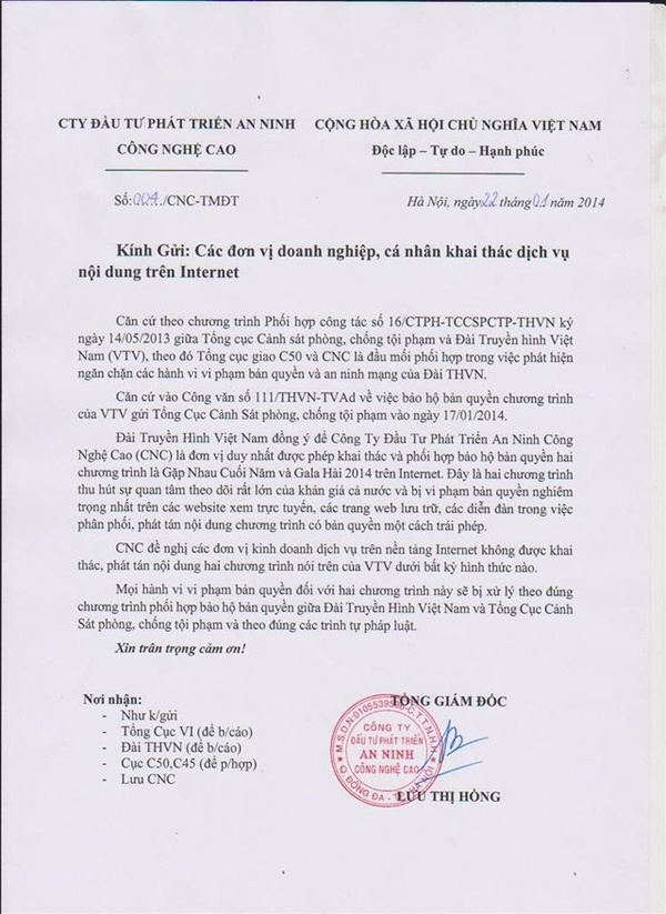 | Văn bản gửi tới các đơn vị khai thác dịch vụ Internet về bản quyền chương trình Táo quân của CNC. Ảnh: Soha. |