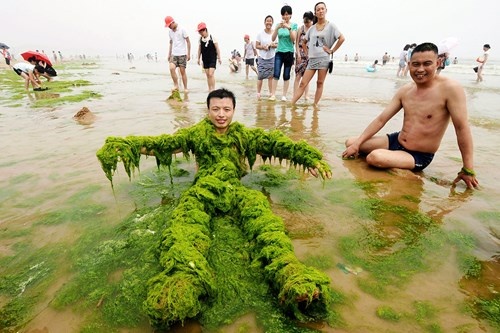 | Cứ đến mùa hè tảo biển ở các bãi biển thuộc tỉnh Sơn Đông, Trung Quốc cũng được dịp sinh sôi và phát triển ồ ạt. Cư dân địa phương dường như đã quá quen với hiện tượng kỳ lạ này, khi tảo biển phủ kín các bãi biển và biến chúng thành một đồng cỏ xanh um khổng lồ. |