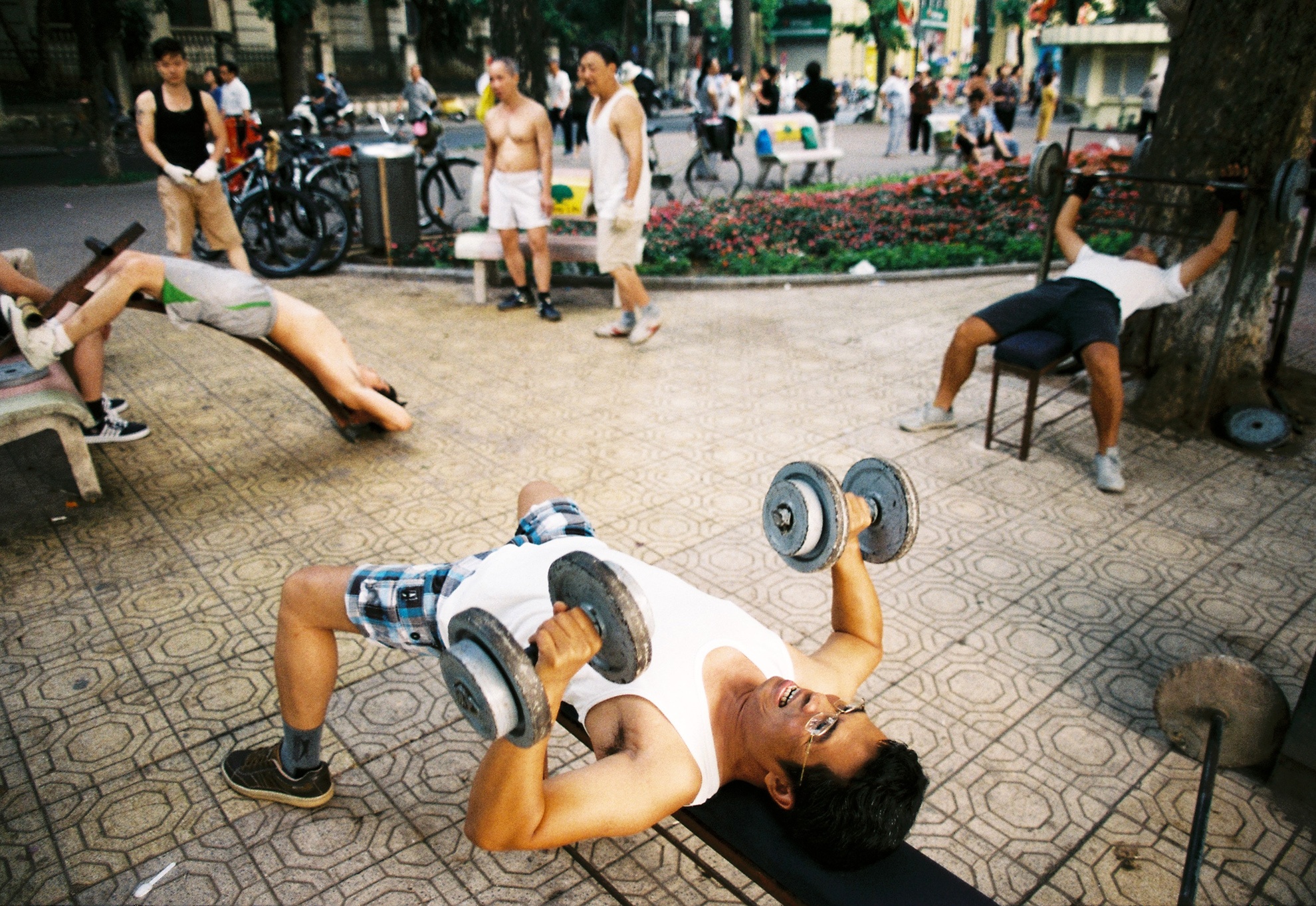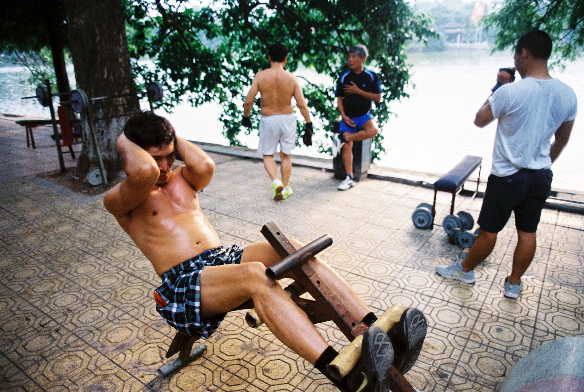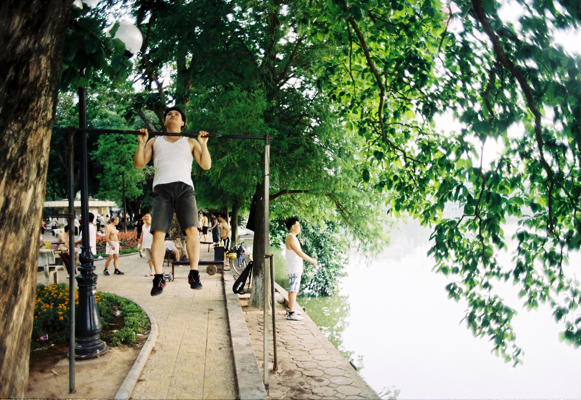 Mỗi sáng sớm hoặc chiều muộn, nhiều đấng nam nhi lại tập trung về vỉa hè hồ Gươm luyện tập thể hình. Họ sử dụng tạ, xà đơn, xà kép tự chế hoặc ghế đá làm dụng cụ.