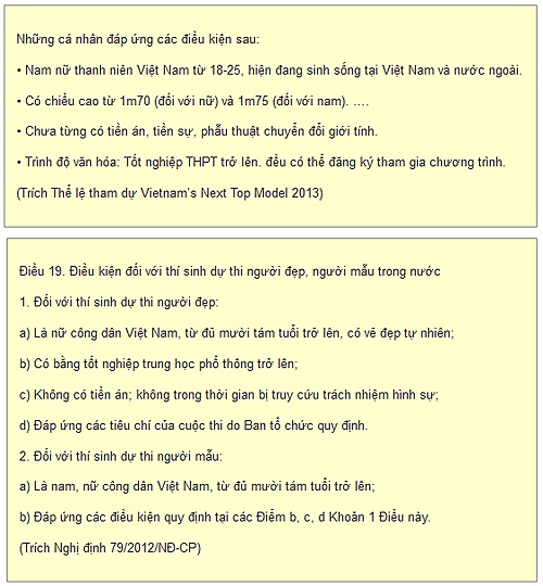 Trước đó, BTC của Người mẫu Việt Nam đã đưa ra những quy định khá khắt khe cho các thí sinh như người tham gia phải là nam nữ thanh niên Việt Nam từ 18-25, đang sinh sống tại Việt Nam và nước ngoài, có chiều cao từ 1m70 (đối với nữ) và 1m75 (đối với nam). Các thí sinh phải là người chưa từng có tiền án, tiền sự, phẫu thuật chuyển đổi giới tính. Trình độ văn hóa tối thiểu tốt nghiệp THPT trở lên.