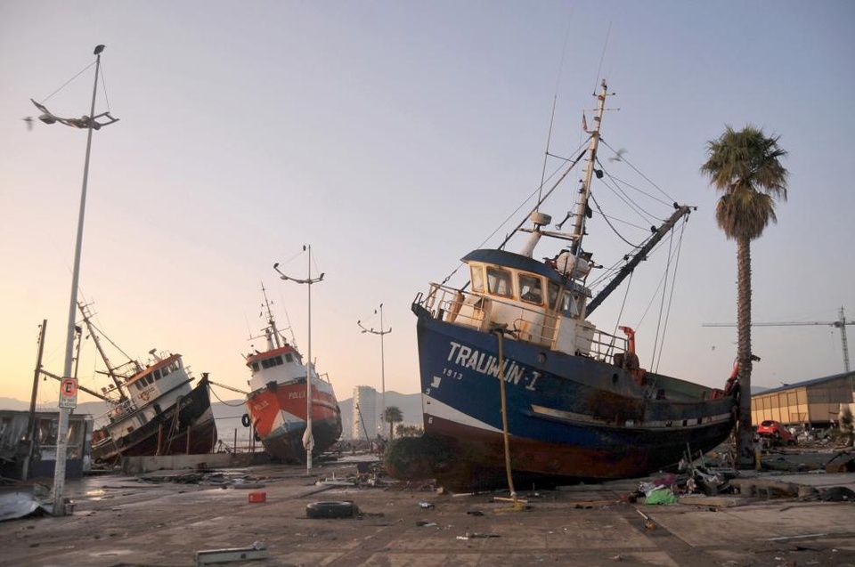 Những chiếc tàu bị sóng đánh dạt lên đường phố ở Coquimbo, thành phố miền trung Chile. Trận động đất mạnh 8,3 độ Richter gây sóng thần cao 5 m ập vào khu vực này hôm 17/9. Ít nhất 11 người chết, hàng chục người bị thương và 1 triệu người phải đi sơ tán sau thiên tai kép. |
