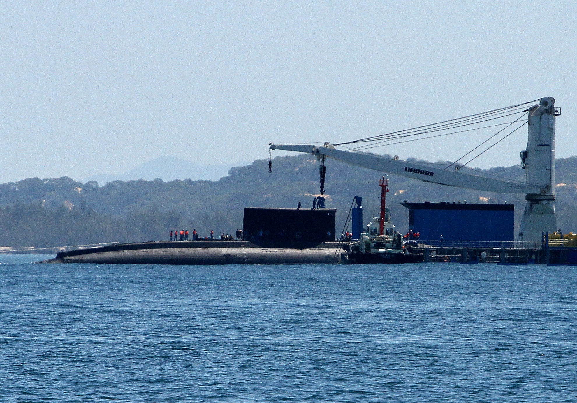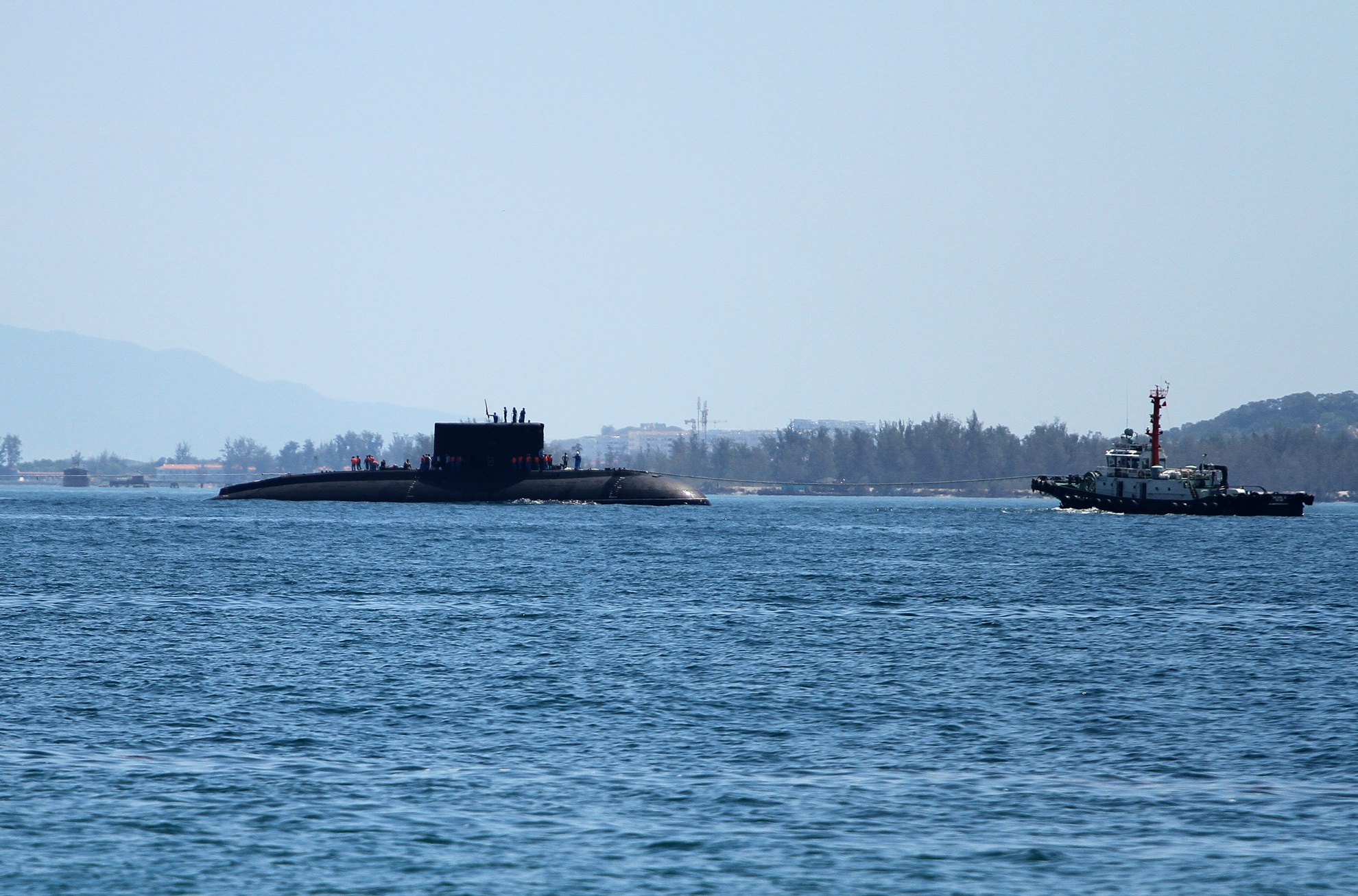 | Tàu ngầm 185 – Khánh Hòa đang được các tàu lai dắt kéo vào cảng Lữ đoàn tàu ngầm 189. |