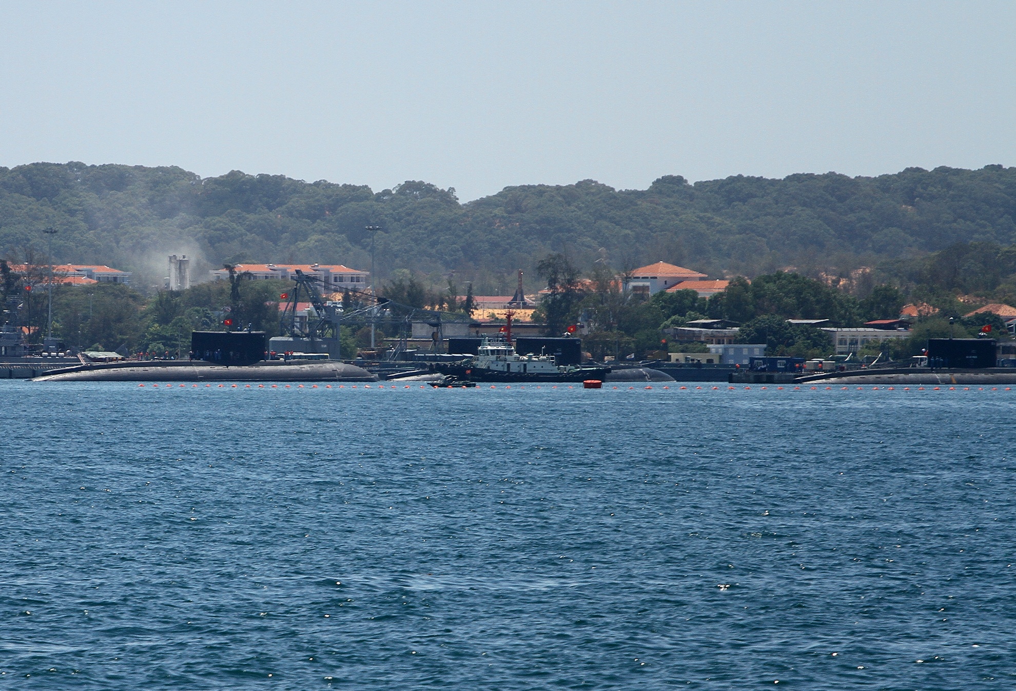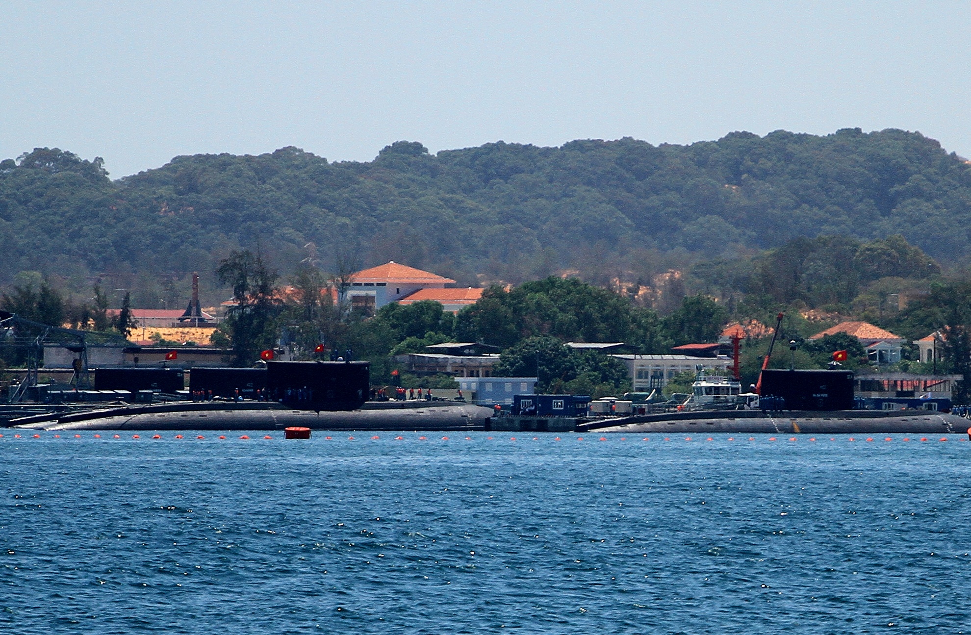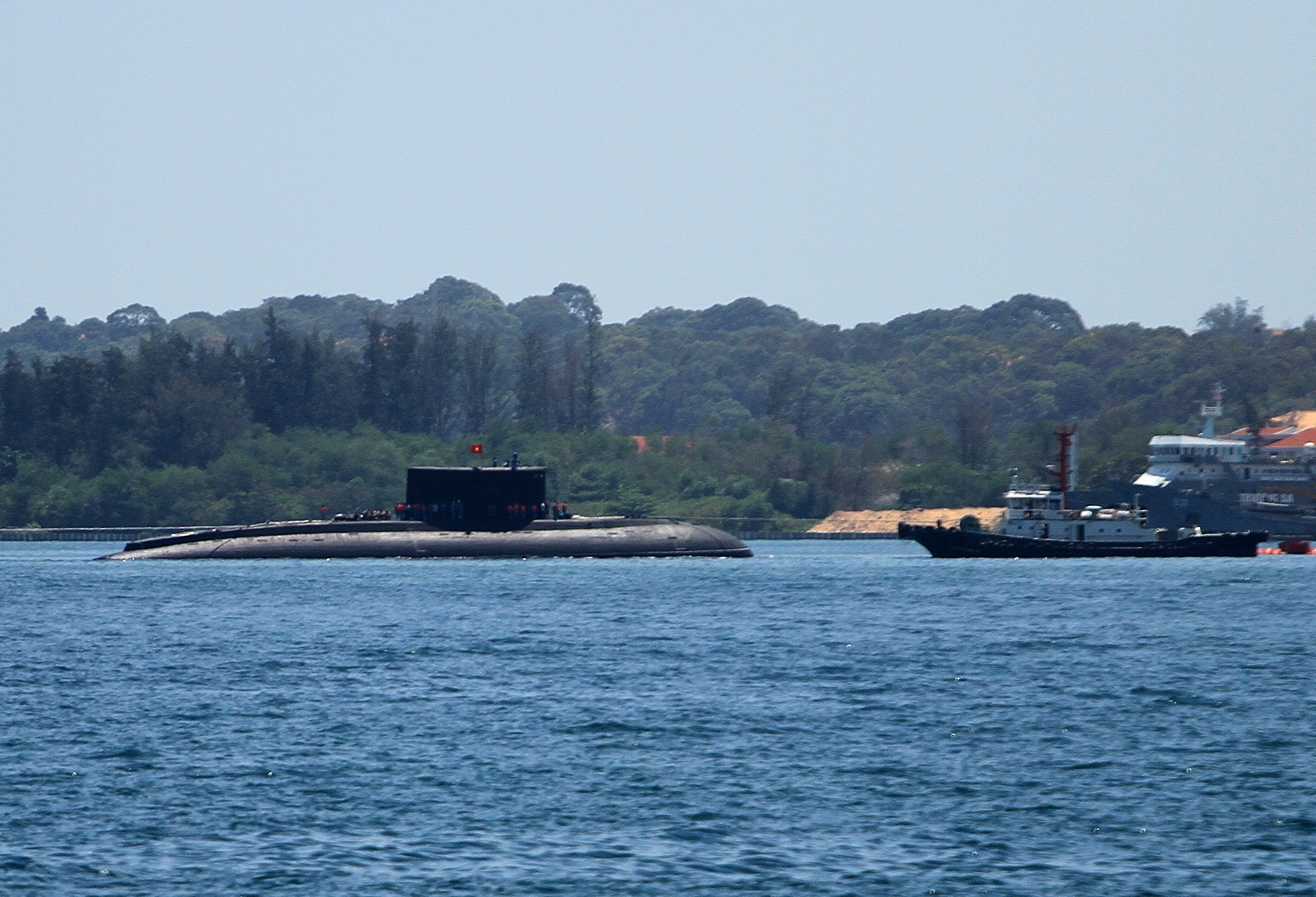 | 10h30 tầu ngầm Kilo 185 - Khánh Hòa giương cờ tổ quốc khi tiến vào khu vực neo đậu cùng 3 tầu ngầm tại đây. Tàu ngầm kilo 185 - Khánh Hòa được tàu Rolldock Storm chở từ Nga về Cam Ranh ngày 30/6. Đây là chiếc tàu ngầm lớp kilo thứ tư trong số sáu tàu ngầm cùng loại mà VN đặt hàng Nga sản xuất. |