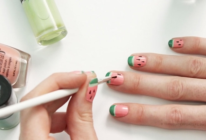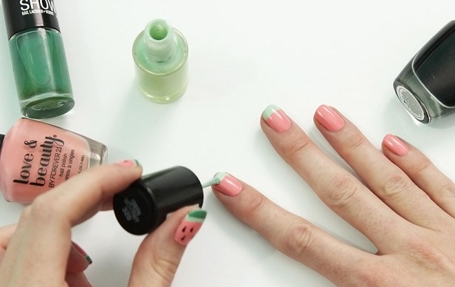 Đầu tiên bạn cần sưu tập đủ 4 màu sơn tượng trưng cho phần vỏ và ruột quả dưa, gồm màu đỏ, xanh, đen và xanh nhạt. Phết sơn hồng lên toàn bộ phần móng và để khô. Tiếp tục quết 1 lớp sơn màu xanh nhạt lên đầu móng tay.