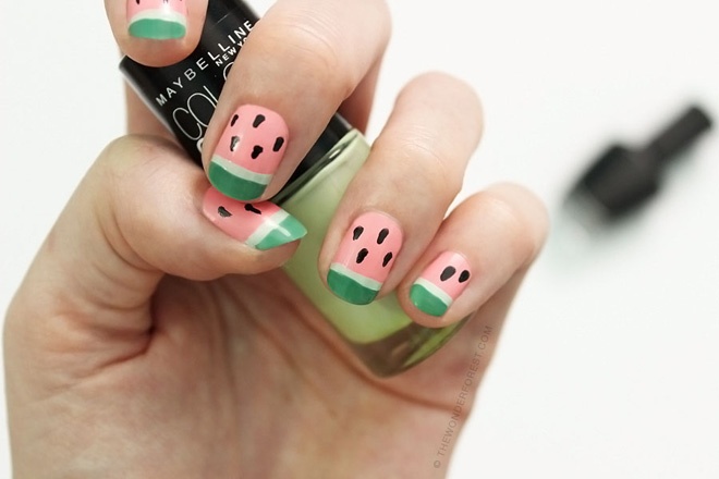 Các kiểu nail lấy cảm hứng từ quả dưa hấu đỏ xanh bắt mắt rất thích hợp để bạn gái phối cùng trang phục hè phóng khoáng.