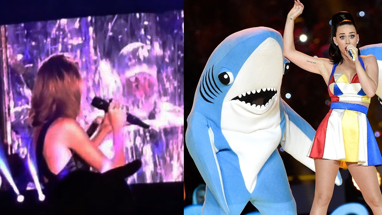 Cá mập trái (Left Shark) vốn là nhân vật nổi tiếng và gắn liền với màn trình diễn tại trận Super Bowl 2015 của Katy Perry. Qua một đoạn video do fan quay được, người ta có thể thấy rằng cá mập xuất hiện từ phía sau tấm kính khi Taylor Swift đang hát. Thế rồi nữ ca sĩ lập tức cười khẩy với chú. Ngọn lửa tư thù giữa hai nữ ca sĩ bảo sao không ngày một lớn thêm.