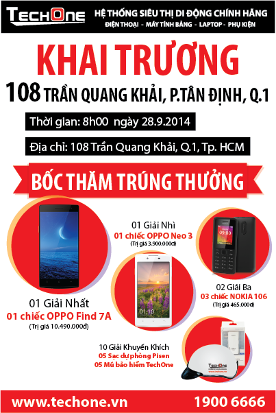 Khách hàng đến mua sắm sản phẩm bất kỳ trên toàn hệ thống TechOne sẽ được nhận phiếu bốc thăm cơ hội trúng iPhone 6, OPPO Find 7A, OPPO Neo 3 cùng hàng nghìn giải thưởng hấp dẫn khác. Tổng giá trị quà tặng lên tới 1 tỷ đồng.