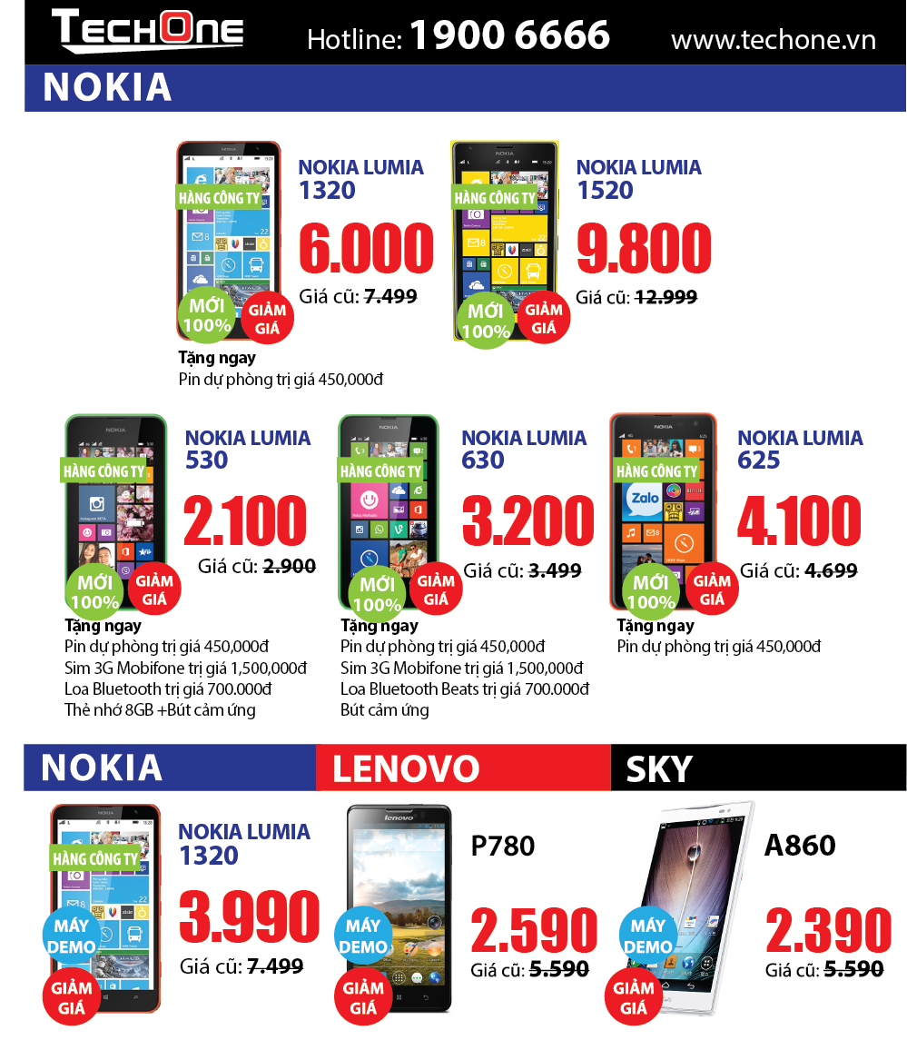 Ngoài ra TechOne triển khai giảm giá hàng loạt điện thoại, máy tính bảng tới 3 triệu đồng.
