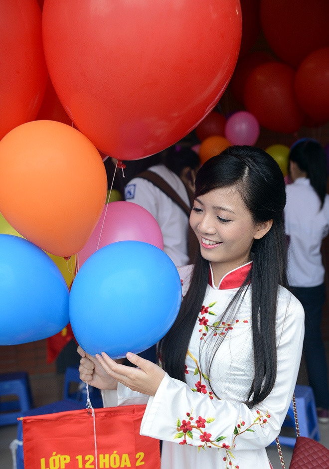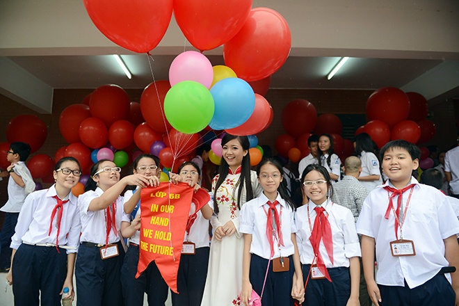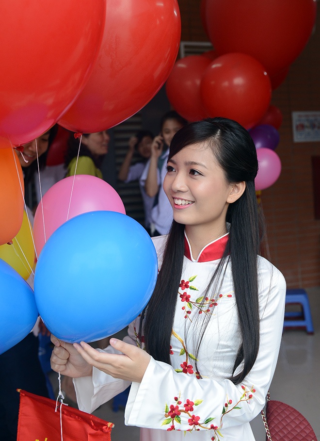 | Với tà áo dài, khuôn mặt dễ thương, cô giáo 9x Phan Hồng Anh là gương mặt nổi bật, thu hút mọi ánh nhìn trong buổi lễ khai giảng tại trường THPT chuyên Hà Nội – Amsterdam diễn ra vào sáng nay (5/9). |