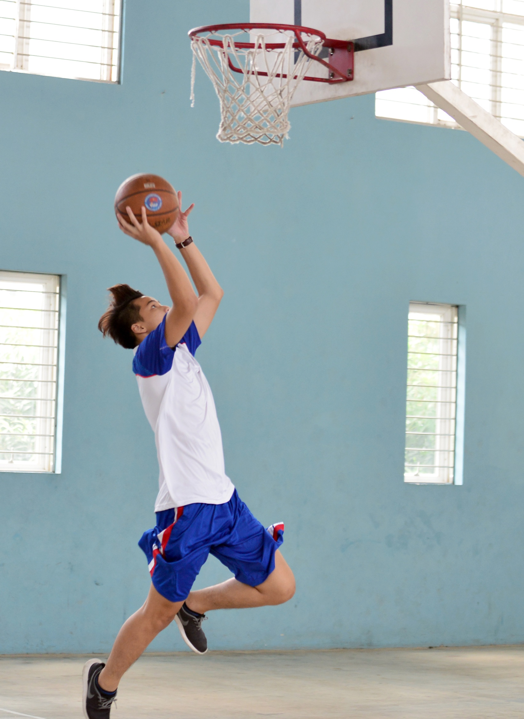 Nam sinh tự tin thể hiện pha ném bóng trong trang phục của nhà trường.