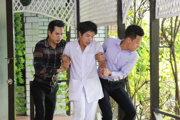 | "Cu Tèo" bị hai người đàn ông hùng hổ lôi đi khiến khán giả tò mò không hiểu tình huống gì đã xảy đến với nhân vật của Thái Hòa. |