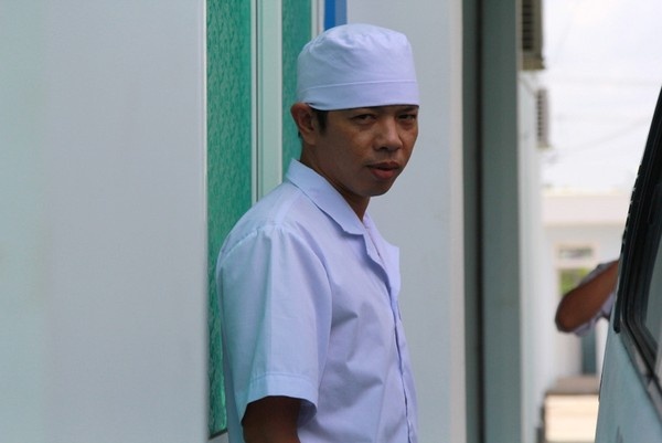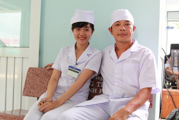 | Tranh thủ chụp hình với cô y tá xinh đẹp. |