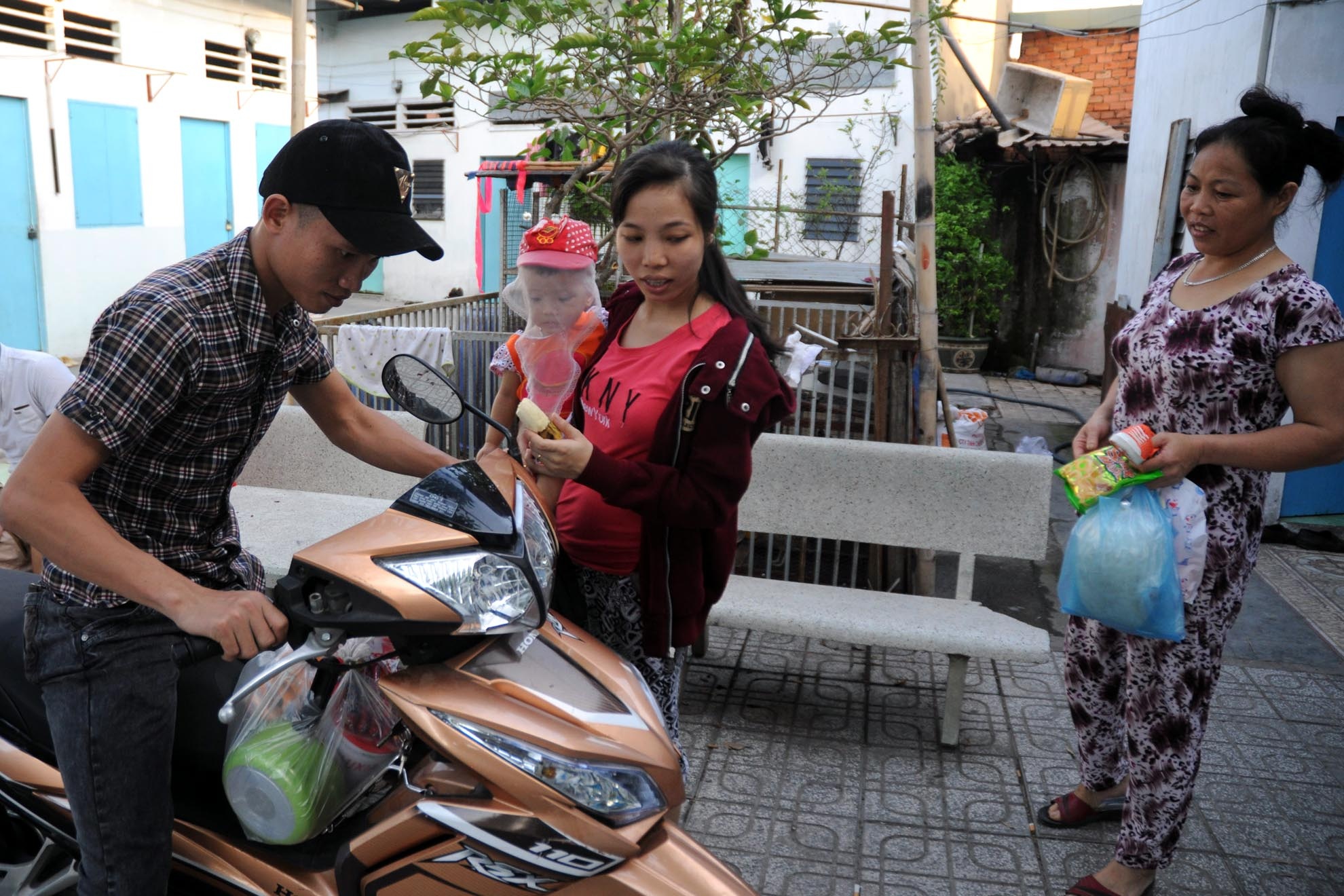 | Gia đình chị Huyền (quê Thanh Hóa) năm nay đón Tết ở Sài Gòn. Người phụ nữ 26 tuổi tâm sự: "Mỗi năm có một cái Tết ai cũng muốn về quê. Tuy nhiên, những ngày cuối năm, chồng em đau ốm nên tiền thuốc tốn kém, không còn đủ tiền mua vé về quê". |