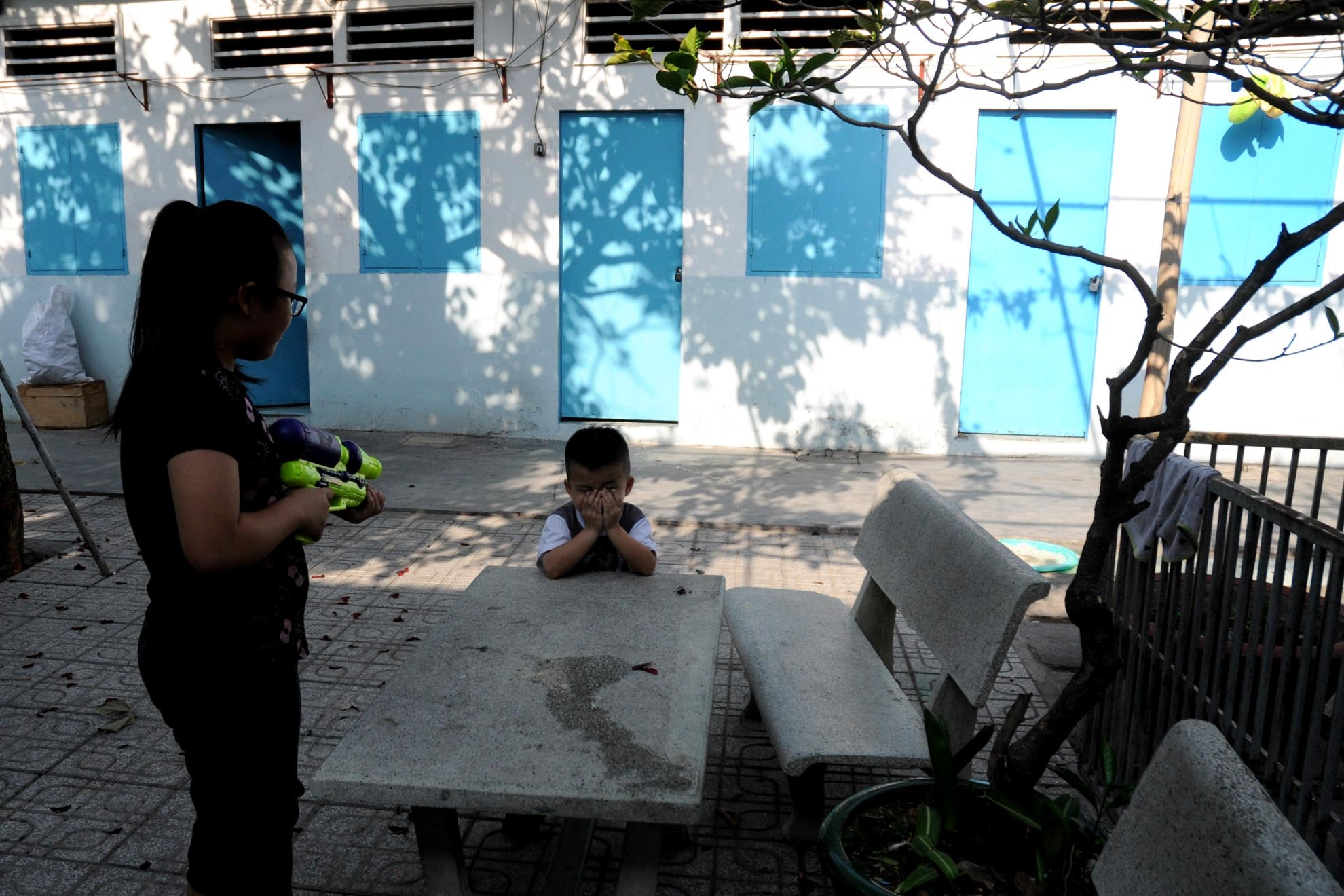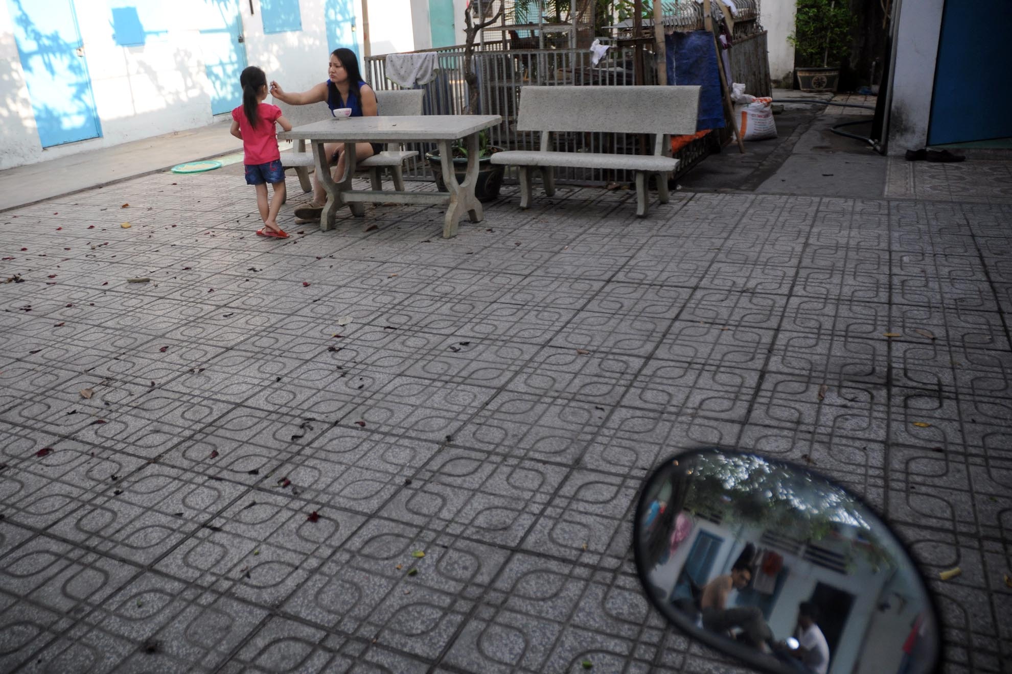| 28 Tết, dãy phòng trọ nằm trong khu công nghiệp Sóng Thần yên vắng hơn ngày bình thường. Những căn phòng rộng chừng 4 m2 lạnh tanh khi chủ nhân đang vẫn còn tăng ca hay bươn chải ngoài đường kiếm sống. Hai đứa trẻ tha thẩn trong sân chơi mấy trò nhàm chán và cũ. |