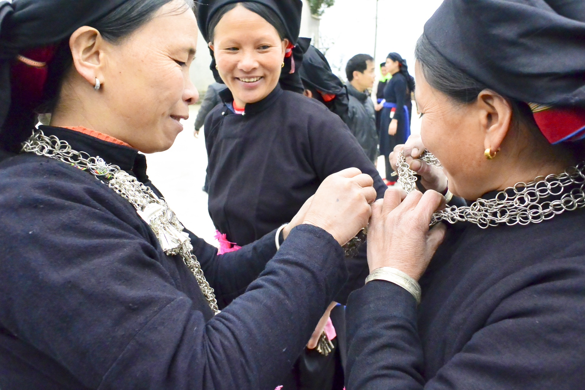 | Sáng mùng một Tết, các chị em phụ nữ dậy thật sớm chuẩn bị cỗ, ăn diện và đeo cho mình những vòng bạc đẹp nhất, quý nhất để đi chơi hội. Với người La Chí thì vòng bạc càng cũ, càng lâu, truyền qua càng nhiều đời trong nhà thì càng quý và có giá trị. Ai đeo càng nhiều thì chứng tỏ người đó cực kỳ ăn diện và sung túc. |