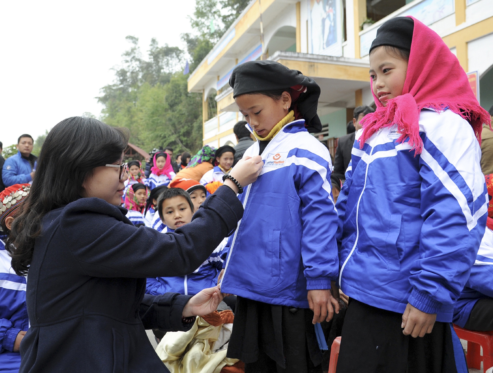 | Các em nhỏ được diện áo ấm mới vừa để đón Tết, vừa để chào đón năm học mới. Trên hình ảnh là một hoạt động trao quà trong chuỗi chương trình "Ấm tình mùa đông" của LienViet PostBank hỗ trợ kinh tế tặng quà dân bản của huyện nghèo Xín Mần suốt 3 năm qua để phát triển về văn hoá, giáo dục, y tế...