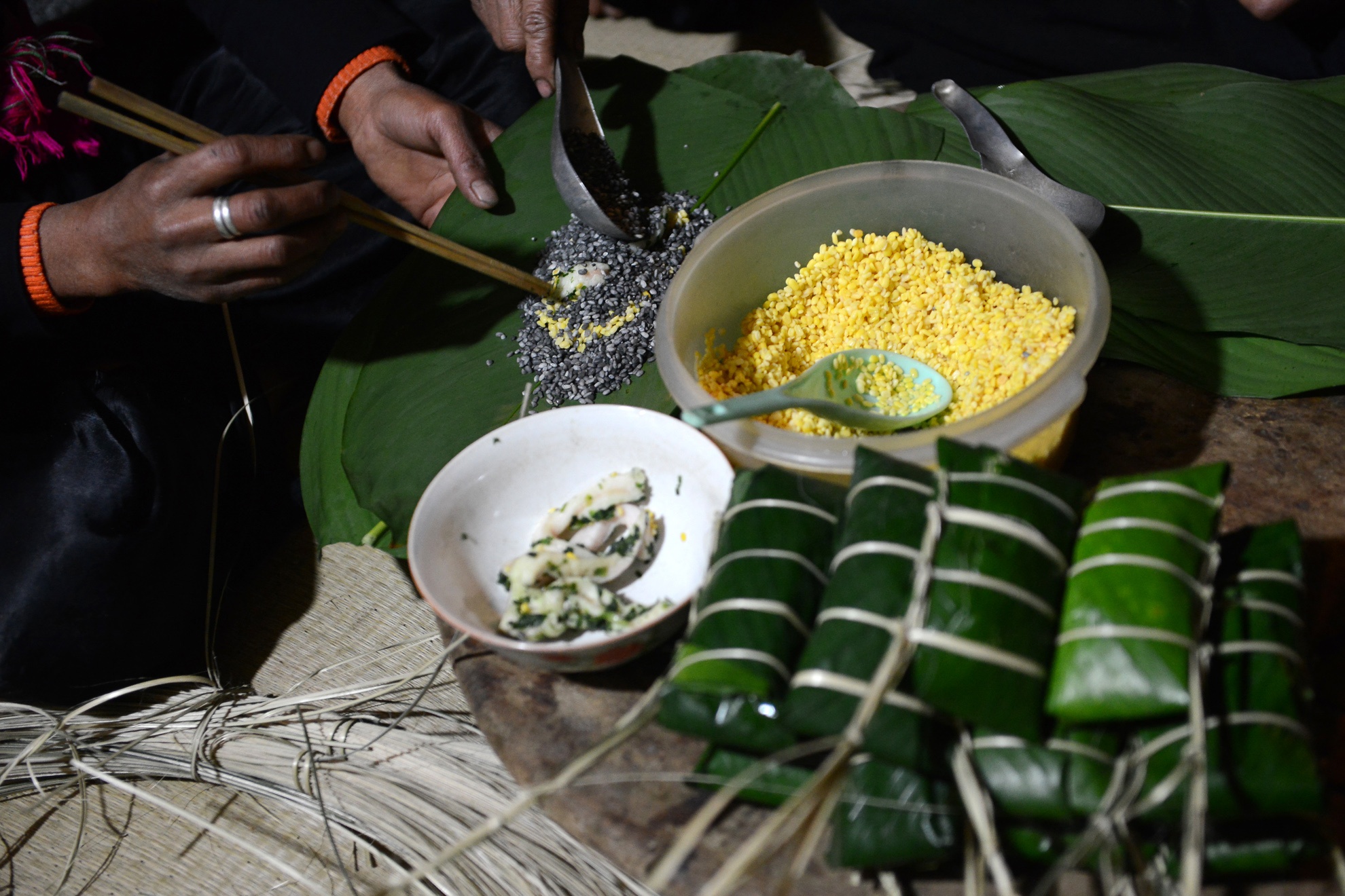 | Công việc gói bánh chưng thường diễn ra trước Tết khoảng hai đến ba ngày và chỉ có con dâu con gái trong nhà mới được cùng mẹ gói, luộc bánh và giữ lửa qua đêm. Do gạo nếp không ngâm nước, để khô trộn với bột than nên bánh phải luộc sau 12 tiếng mới chín. |