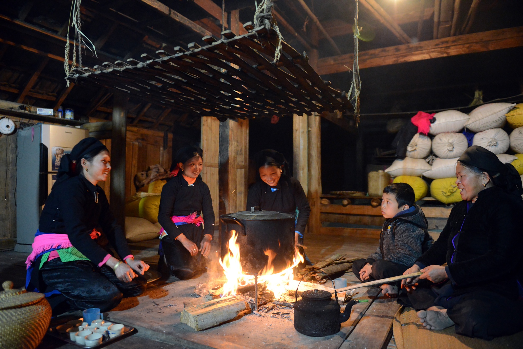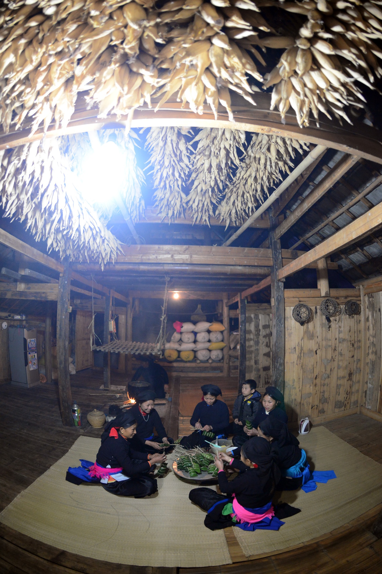 | Tại nhà bà Vàng Thị Me (thôn Díu Thượng, xã Bản Díu, huyện Xín Mần, Hà Giang), chị em trong họ quây quần bên bếp lửa nhà sàn cùng gói bánh chưng đen. |