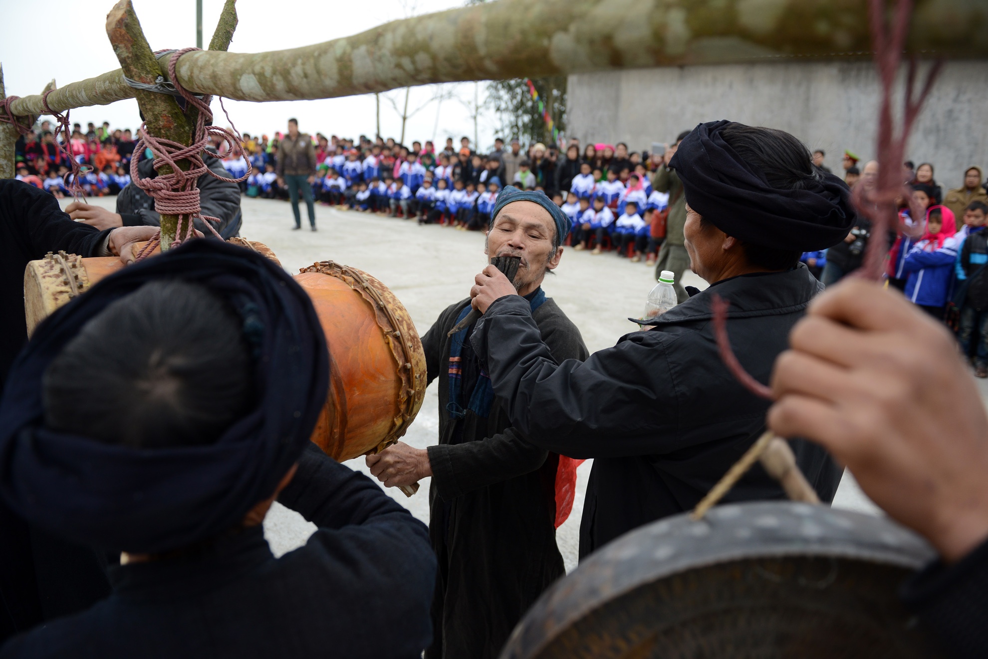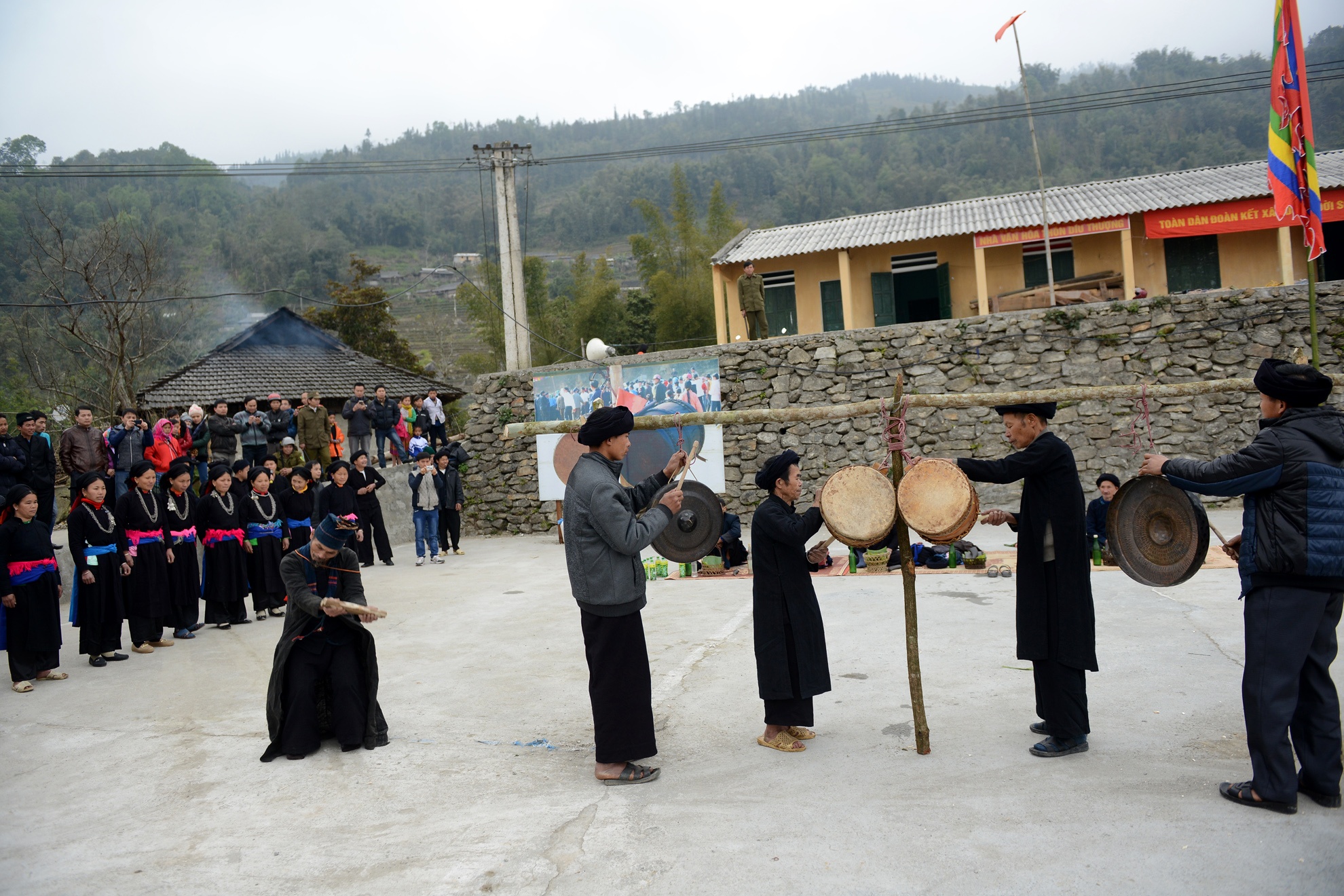 | Các trưởng họ lần lượt đánh chiêng trống treo ở giữa sân, Mổ Cóc mặc áo chủ tế nhảy múa xung quanh thực hiện bài cúng mời tổ tiên người La Chí về ăn Tết cùng dân bản. |