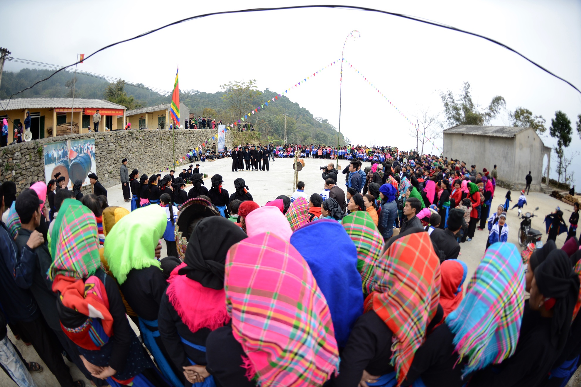| Từ sáng sớm, sân bóng thôn Díu Thượng nằm trên quả đồi cao nhất trong huyện đã chật kín đồng bào các dân tộc đổ về chờ xem lễ tế và chơi hội. |
