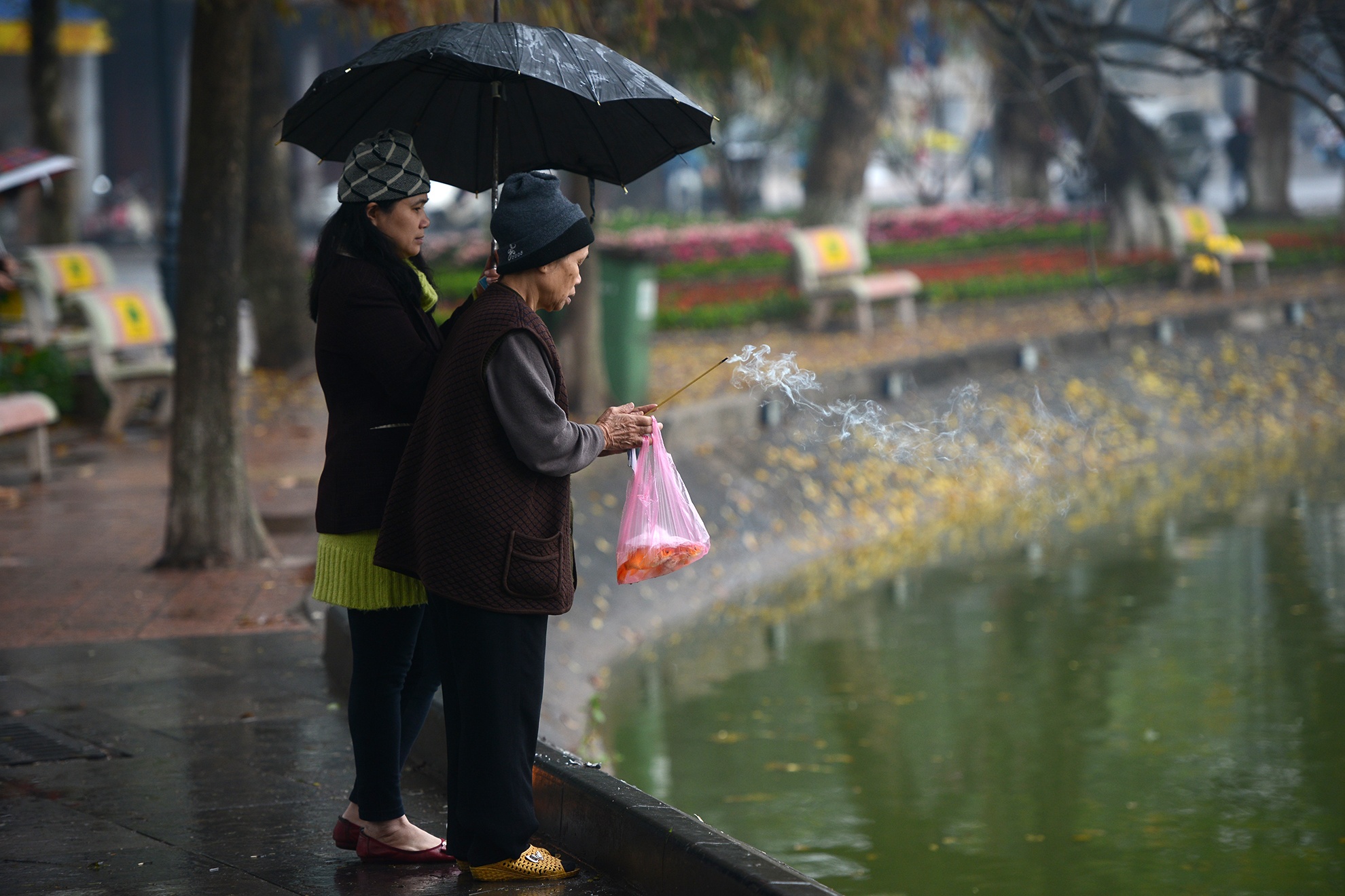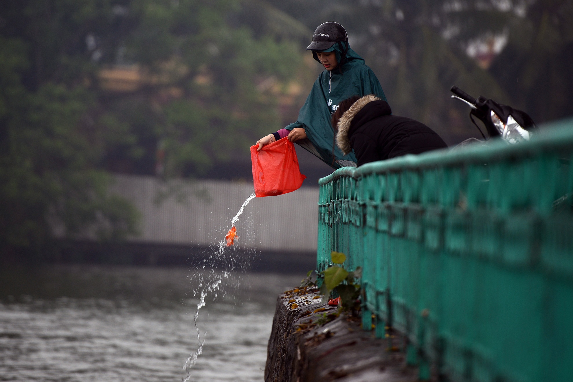 Hà Nội sáng nay có mưa nhỏ, nhiều người phải mặc áo mưa đi thả cá.