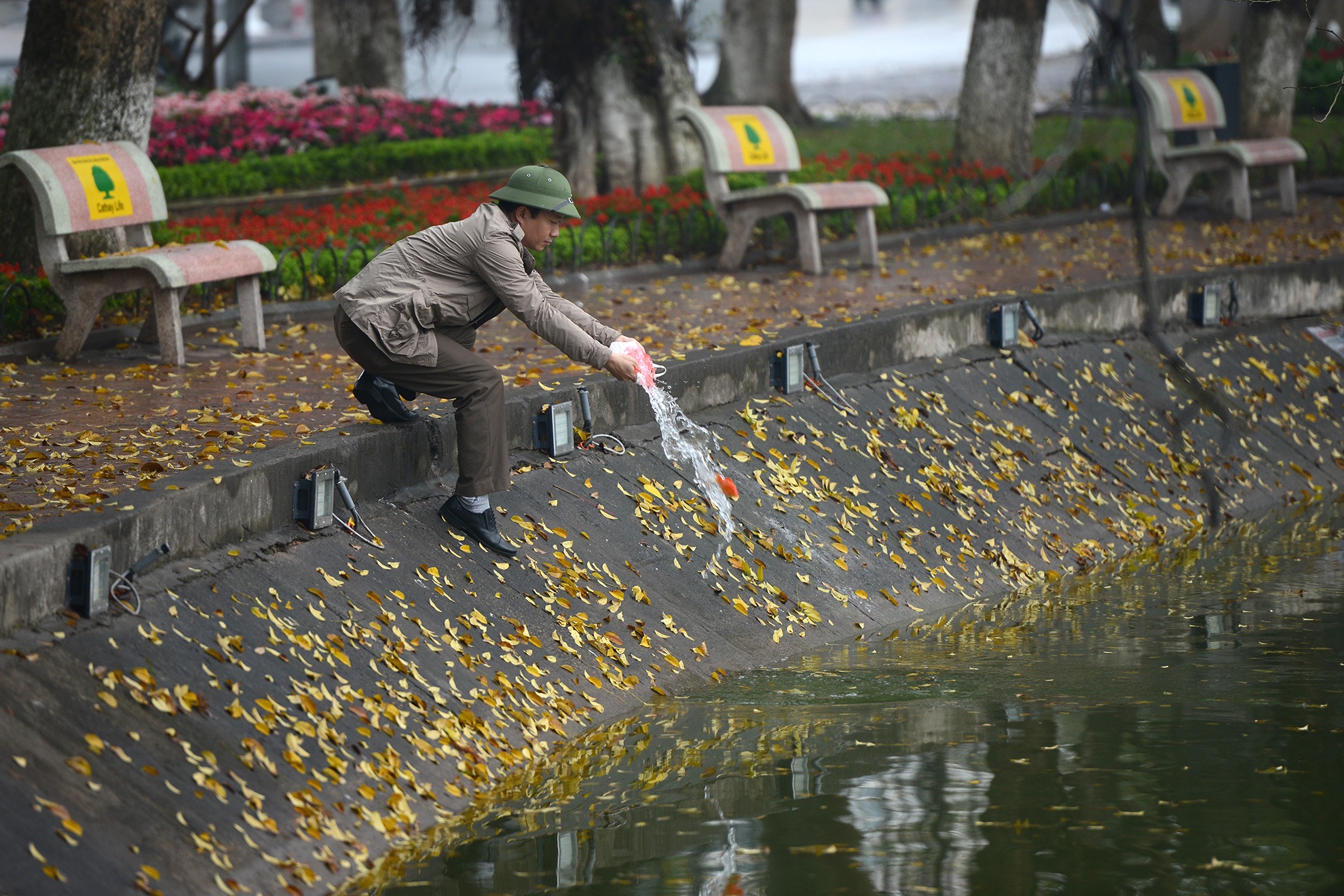 Sáng nay, khắp các sông hồ tại Hà Nội nhộn nhịp cảnh người dân thả cá chép, thậm chí quăng cả bàn thờ, nhang hương xuống mặt nước tiễn Táo quân chầu trời.