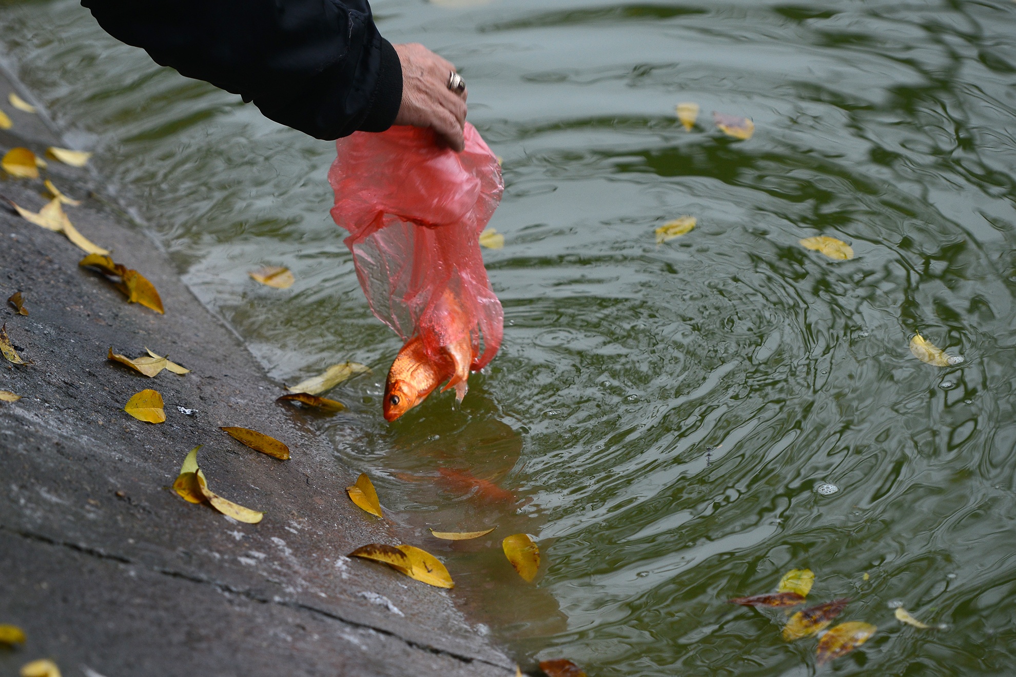 Trưa 11/2, một người phụ nữ giấu tên đến hồ Tây cùng với chiếc thùng to chứa hàng nghìn con cá chép vàng làm nhiều người nhầm tưởng là đi bán cá dạo.