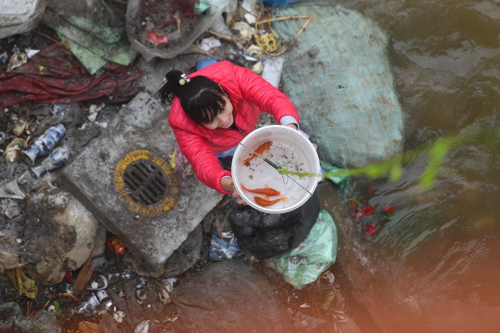 | Cảnh thả cá chép đỏ làm phương tiện cho ông Táo lên trời lại diễn ra nhộn nhịp. |