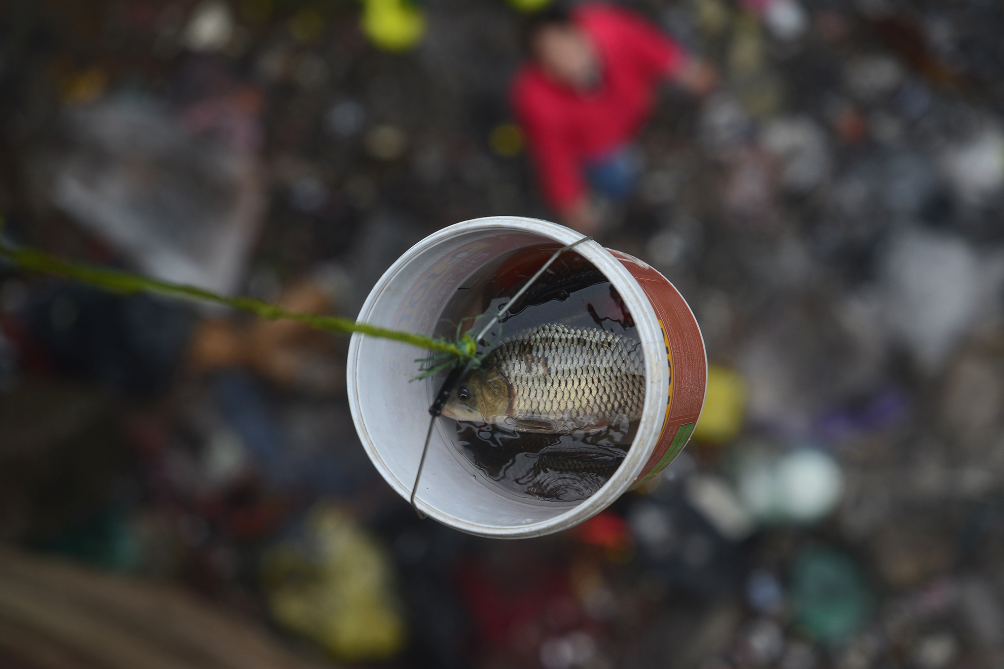 | Họ cho cá vào trong xô lớn rồi ròng dây xuống bờ sông. |