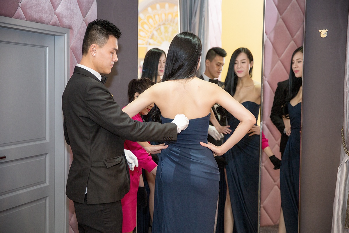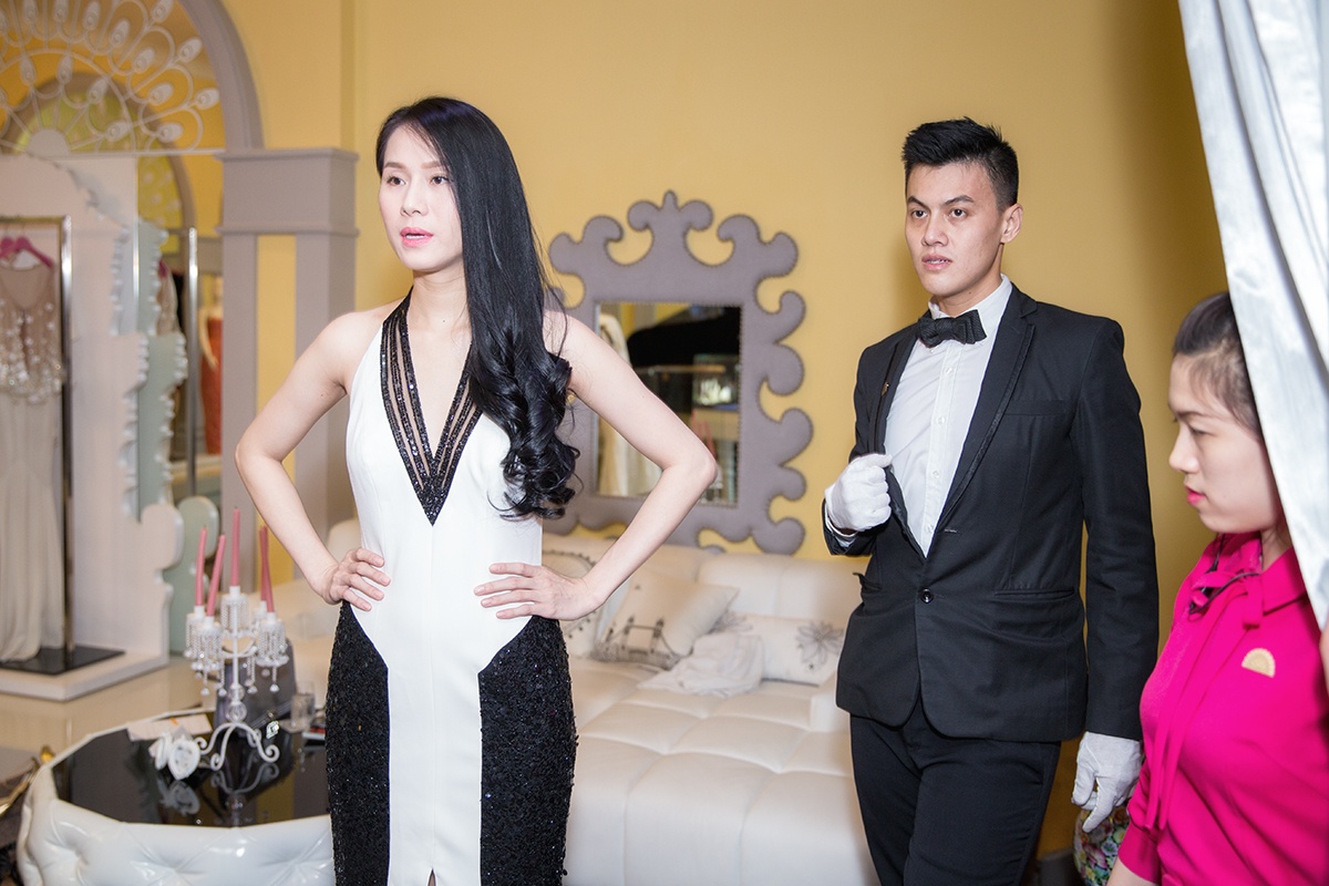 Các chuyên gia stylist của showroom Lý Nhã Kỳ tận tình trợ giúp người đẹp thử đồ.